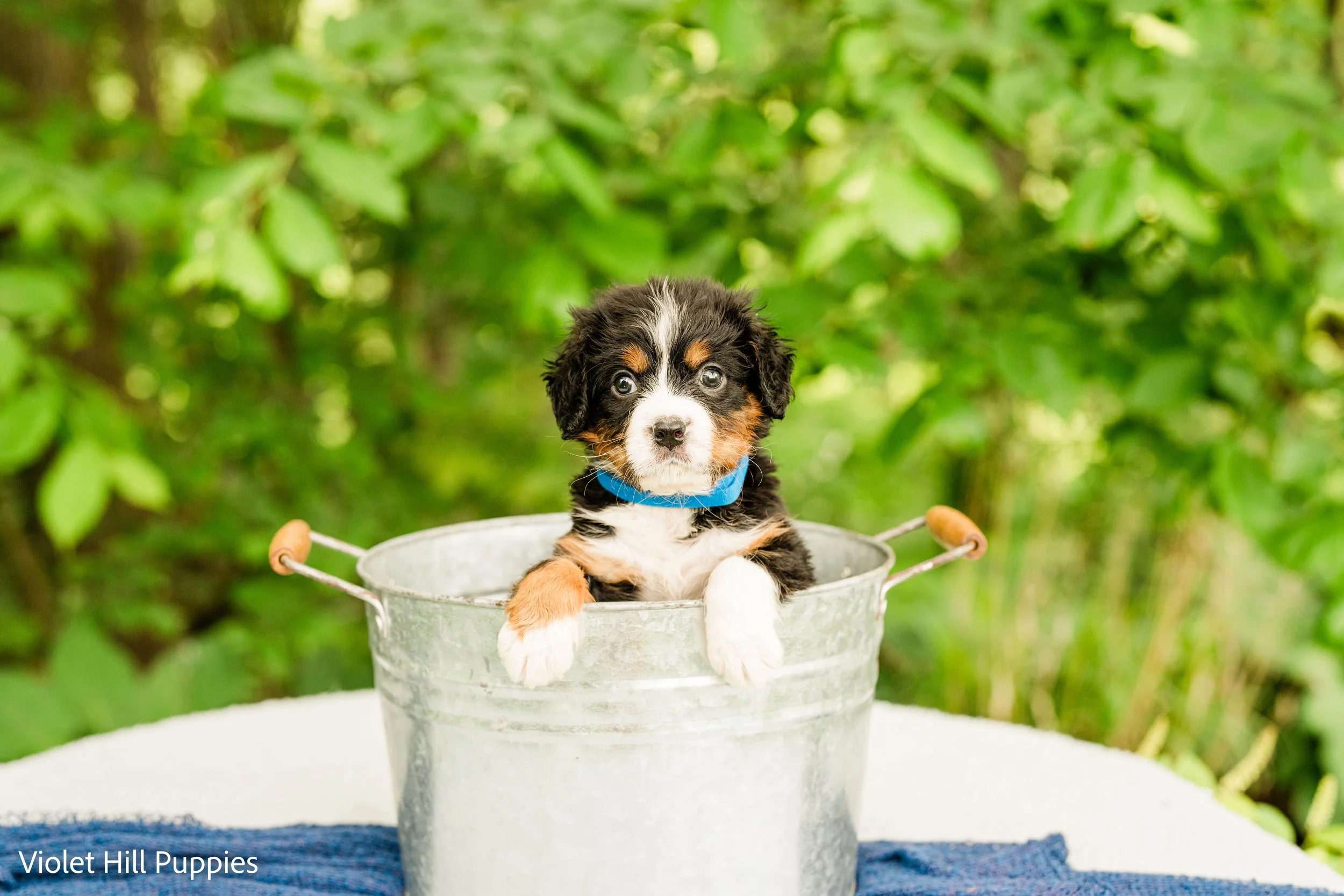There will be new photos every two weeks of Dark Blue puppy, so check back in two weeks to see how the Mini Bernese puppy is growing.