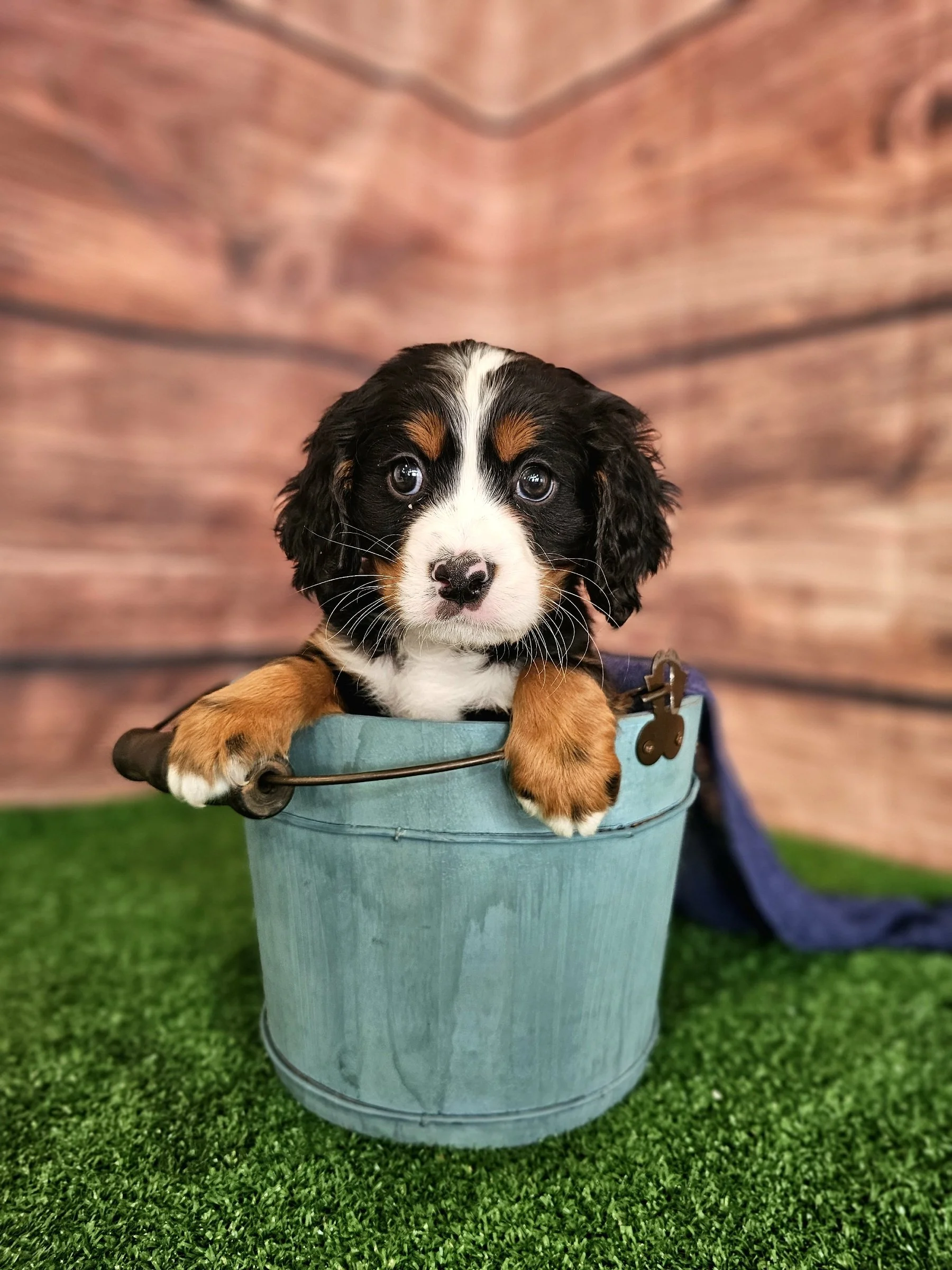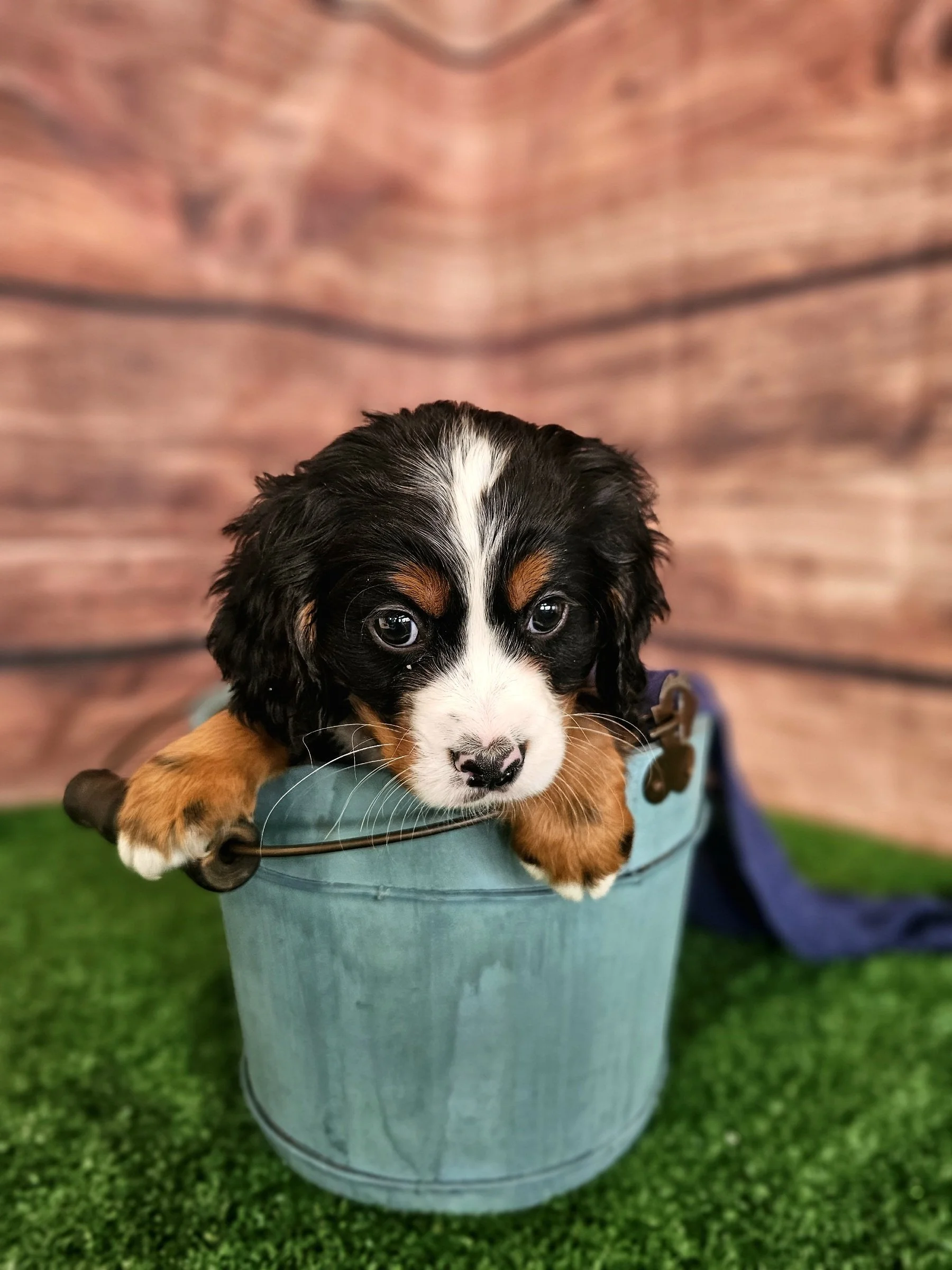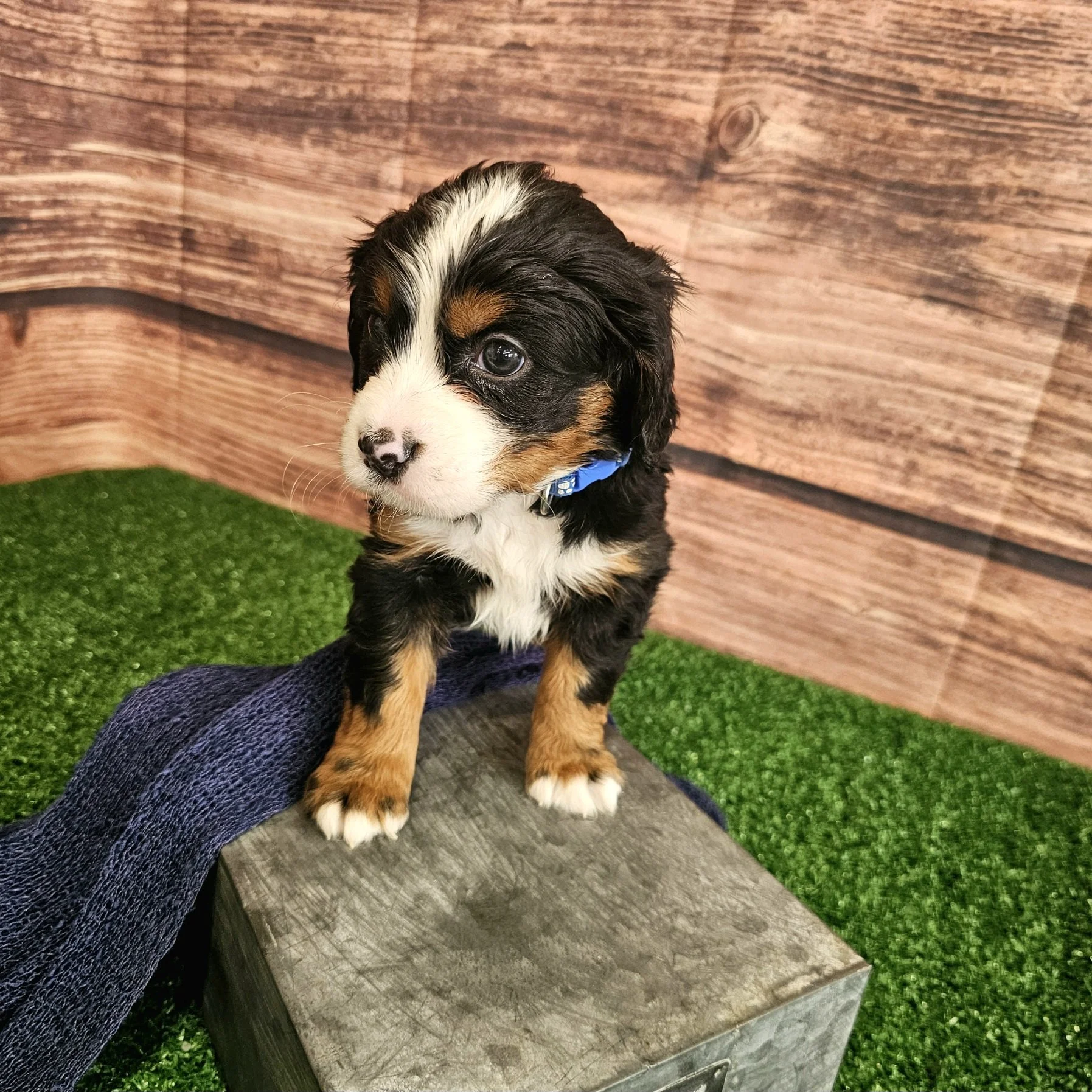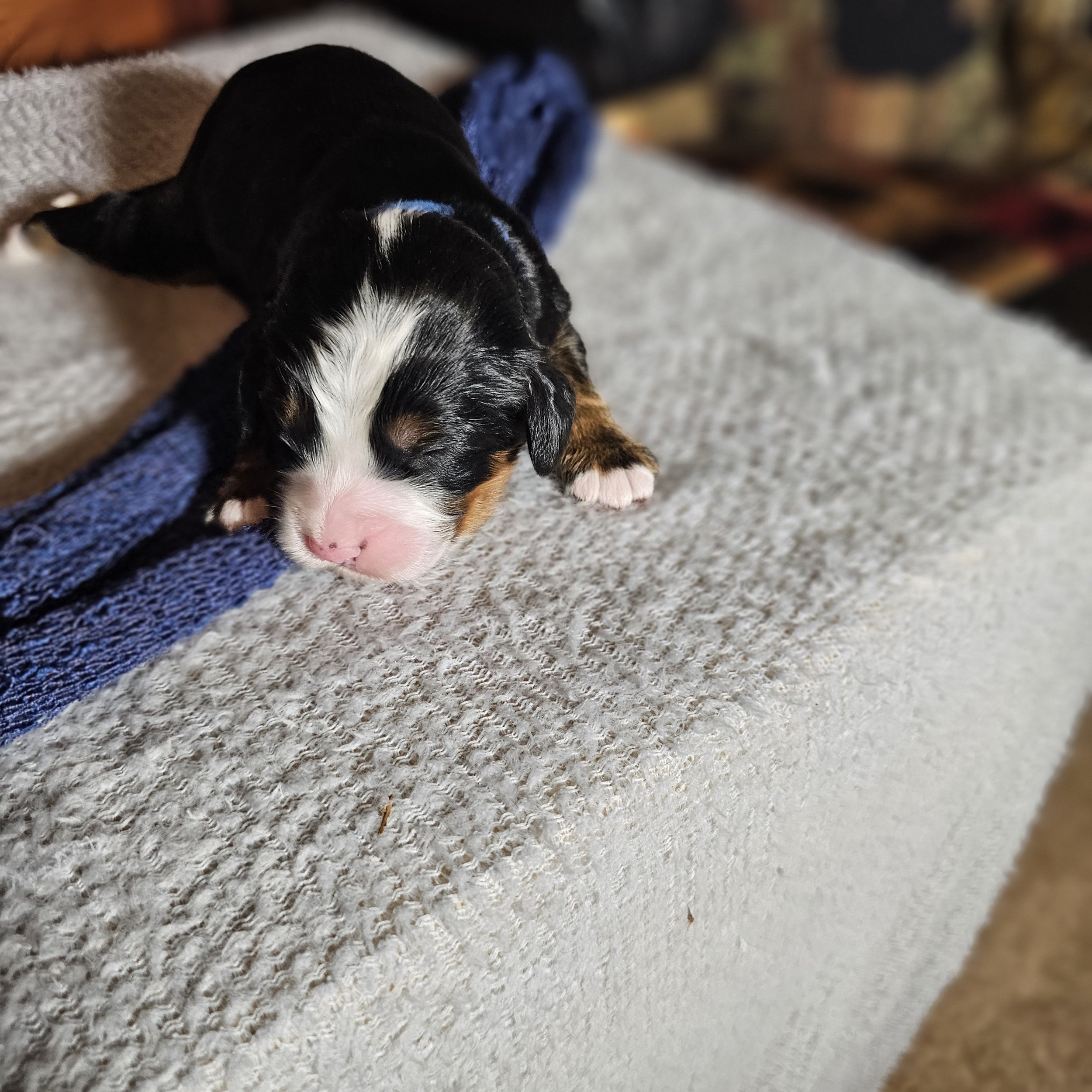 There will be new photos every two weeks of Dark Blue puppy, so check back in two weeks to see how the Mini Bernese puppy is growing.