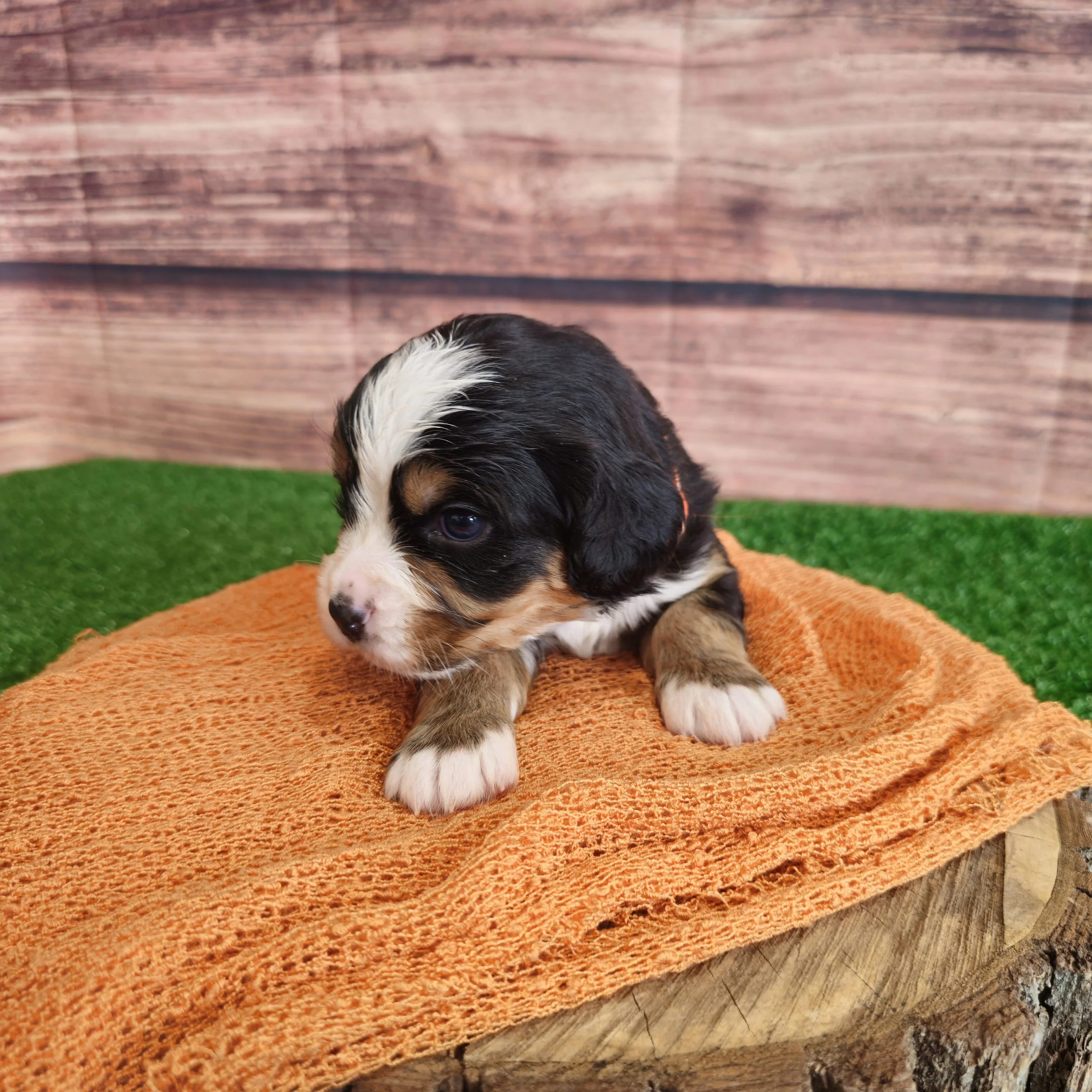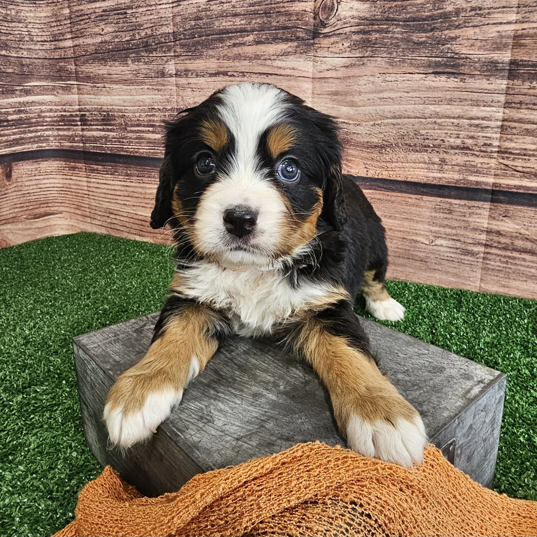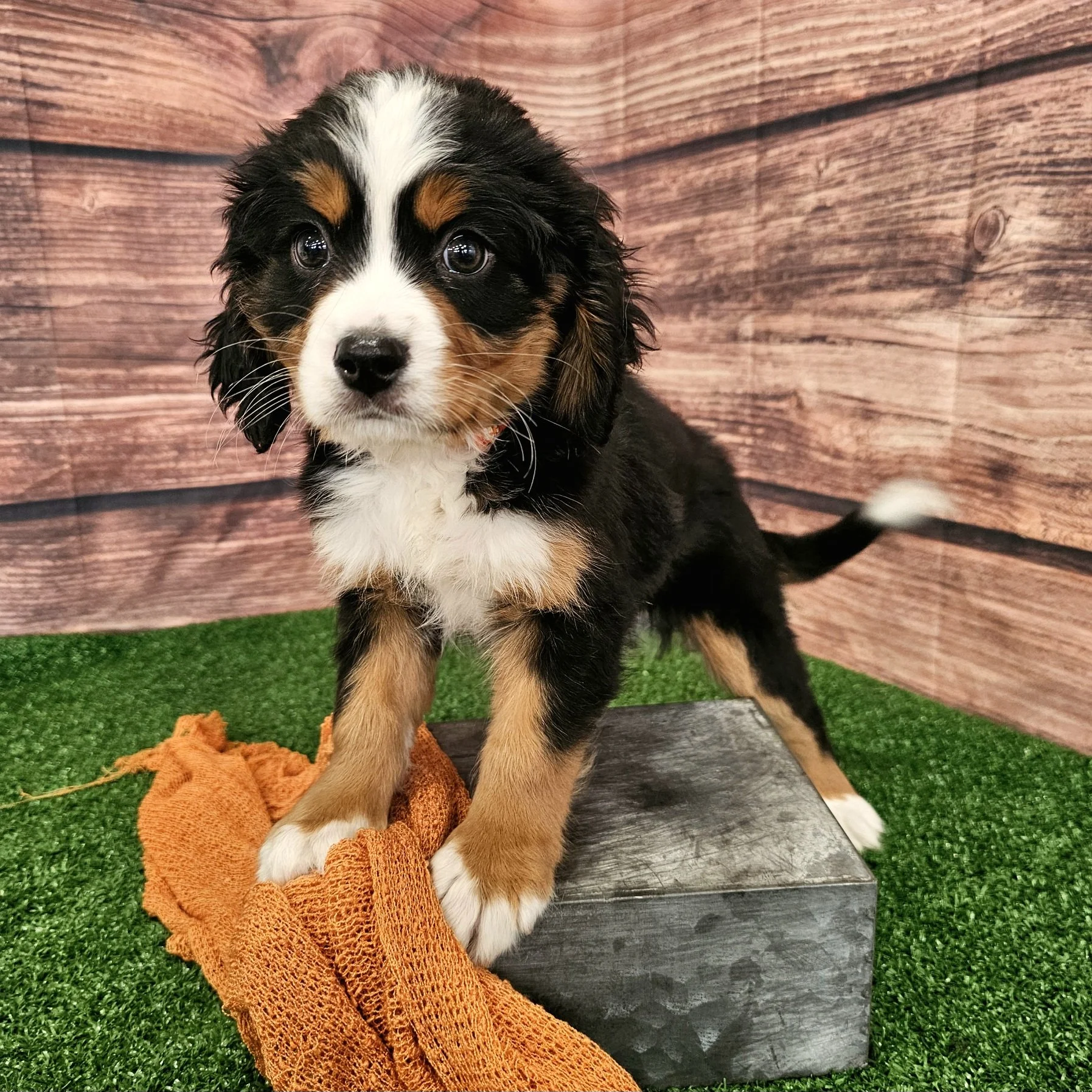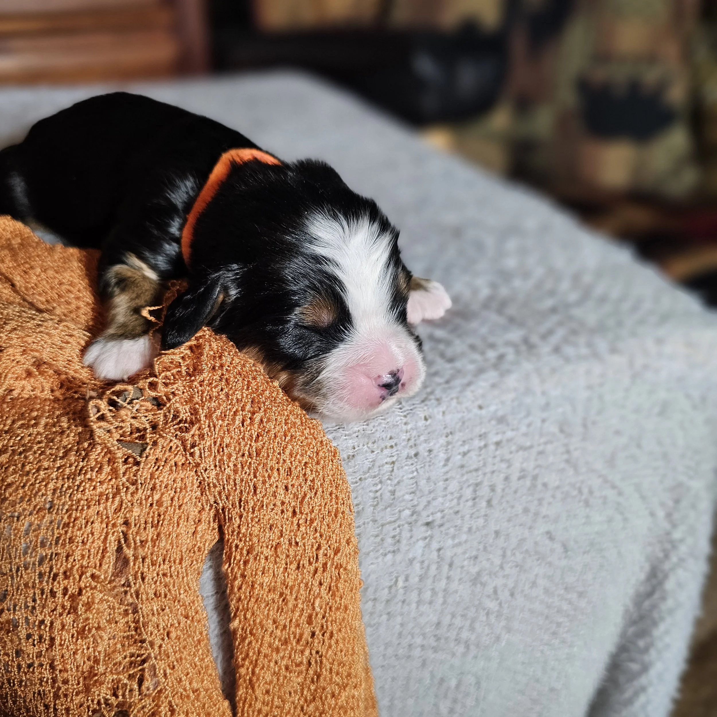 There will be new photos every two weeks of Orange puppy, so check back in two weeks to see how the Mini Bernese puppy is growing.