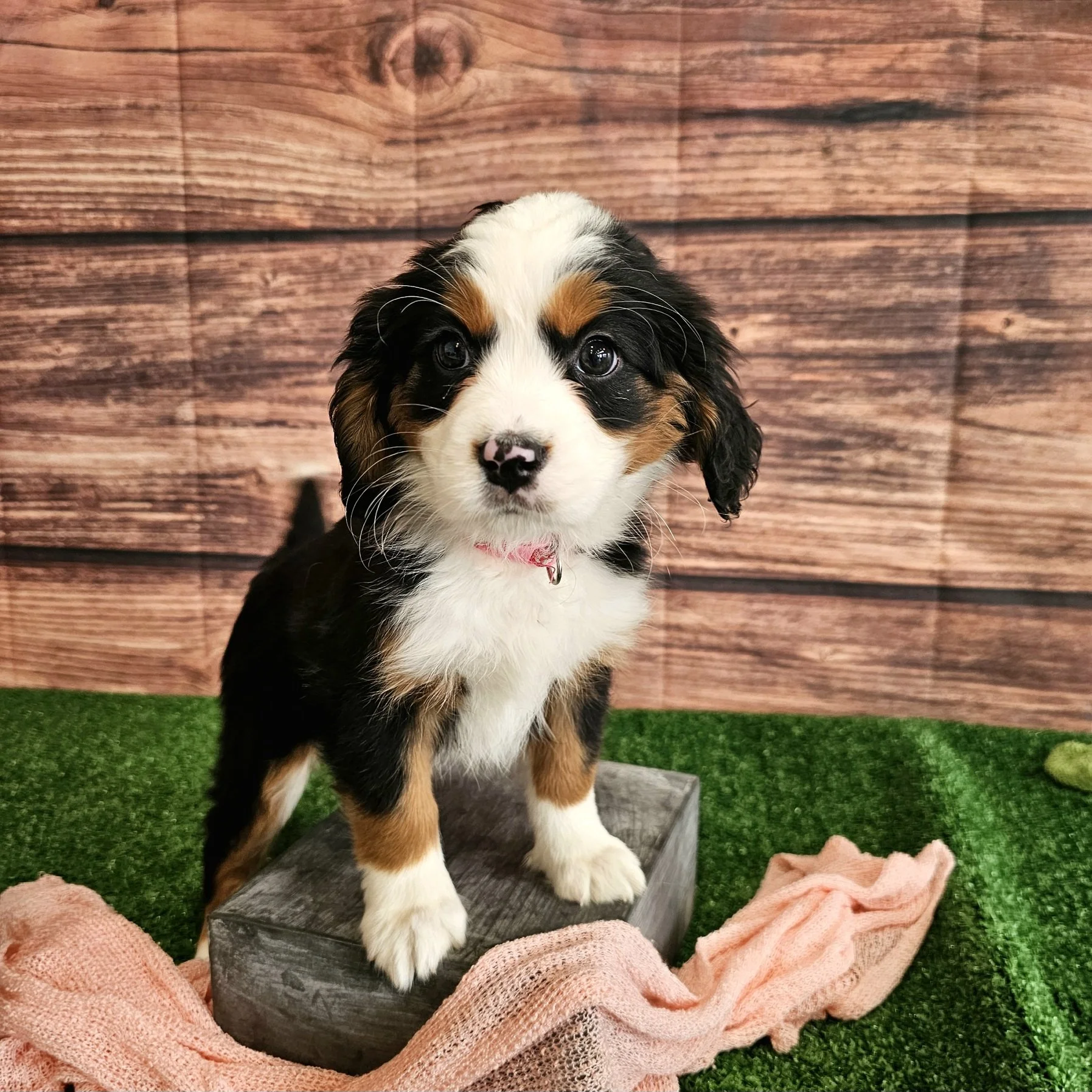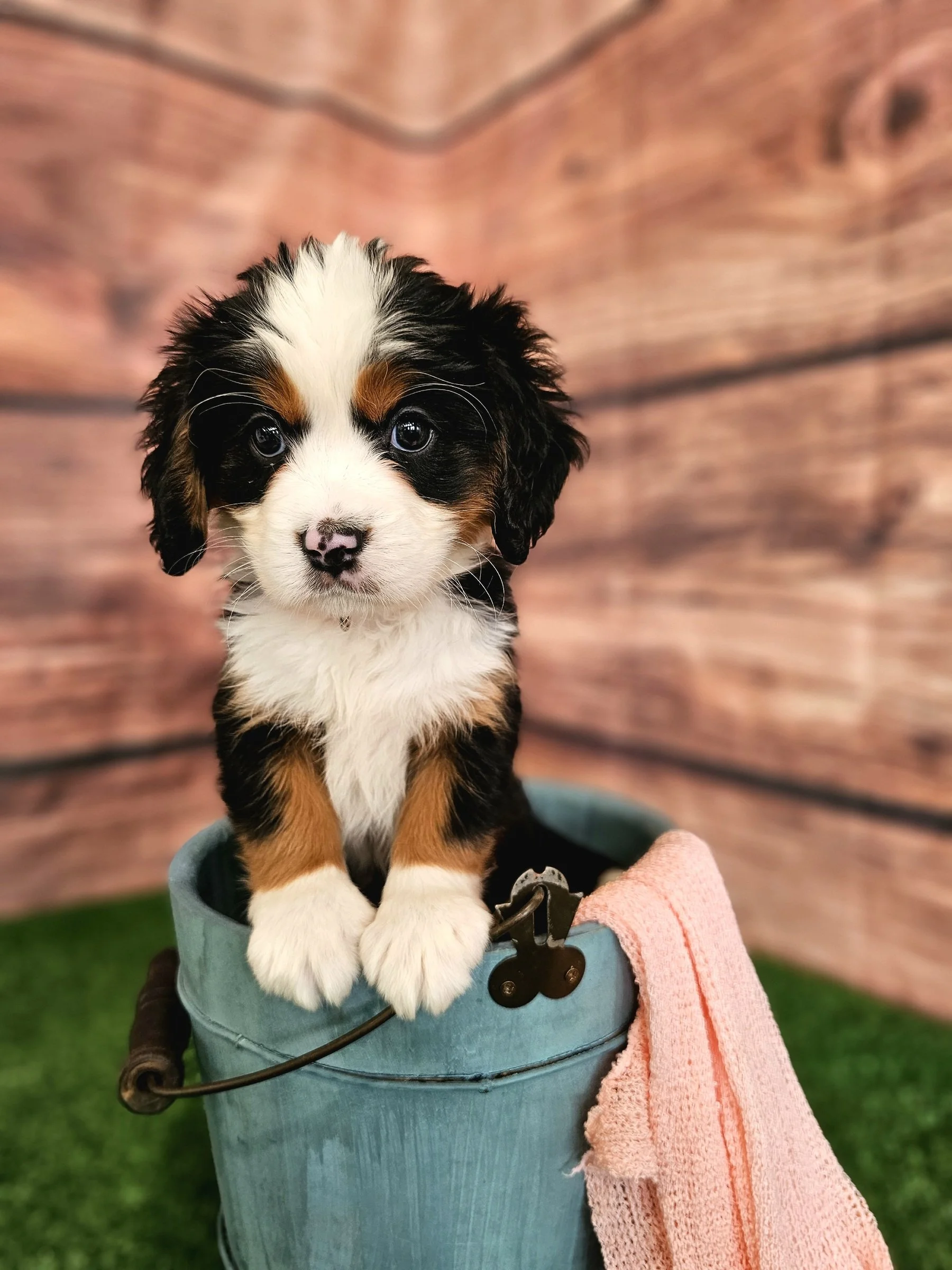 There will be new photos every two weeks of Pink puppy, so check back in two weeks to see how the Mini Bernese puppy is growing.